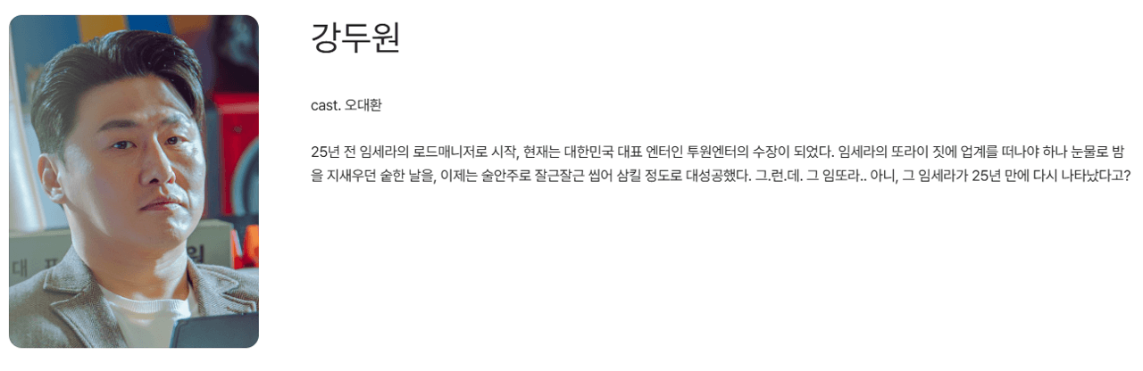 | 오대환 | 강두원 | 25년 전 임세라의 로드 매니저. 현재는 대형 엔터테인먼트 투원엔터의 대표가 되었습니다. |