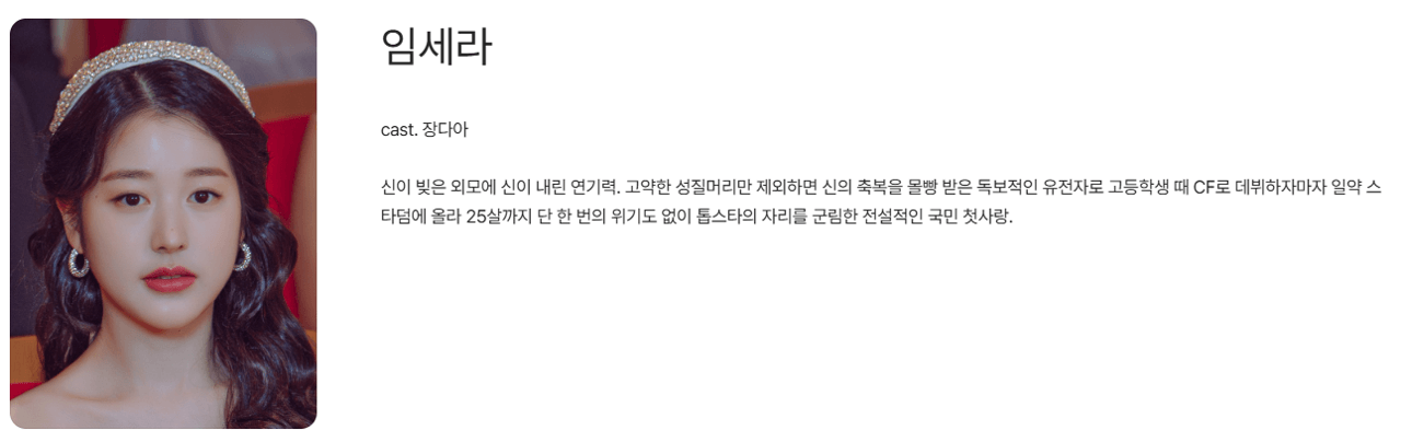 | 장다아 | 임세라 | 1999년 대한민국을 사로잡았던 '국민 여신' 톱스타. 주변의 견제와 시련에 시달립니다. |