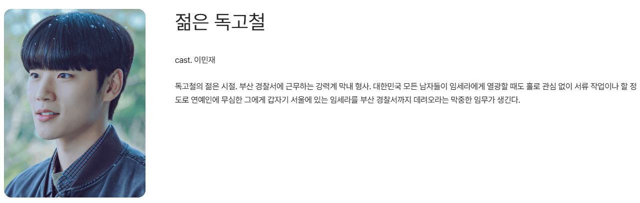| 이민재 | 독고철 (젊은 시절) | 1999년 임세라의 사건에 얽힌 강력계 신입 형사. 그녀에게 '0728' 번호로 전화를 걸며 인연을 맺습니다. |