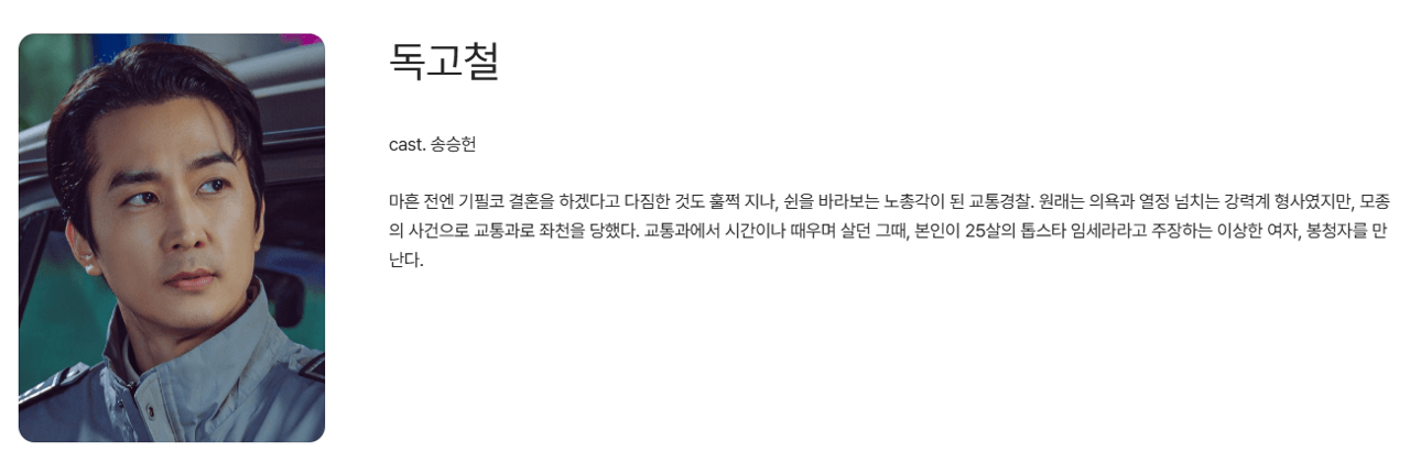 | 송승헌 | 독고철 | 과거 임세라와 특별한 인연이 있던 형사. 현재는 교통경찰로 좌천되어 봉청자를 만나게 됩니다. 겉은 무뚝뚝하지만 봉청자를 돕게 됩니다. |