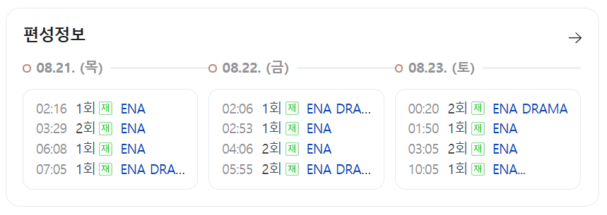 | 요일 | 주요 재방송 시간 (ENA 채널 기준) |