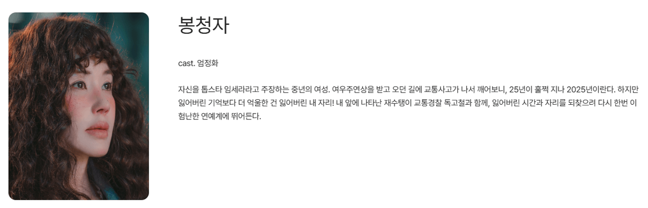 | 엄정화 | 봉청자 | 교통사고 후 25년의 기억을 잃고 깨어난 톱스타 임세라의 현재 모습. 25세의 기억만 남아 혼란스러워합니다. |