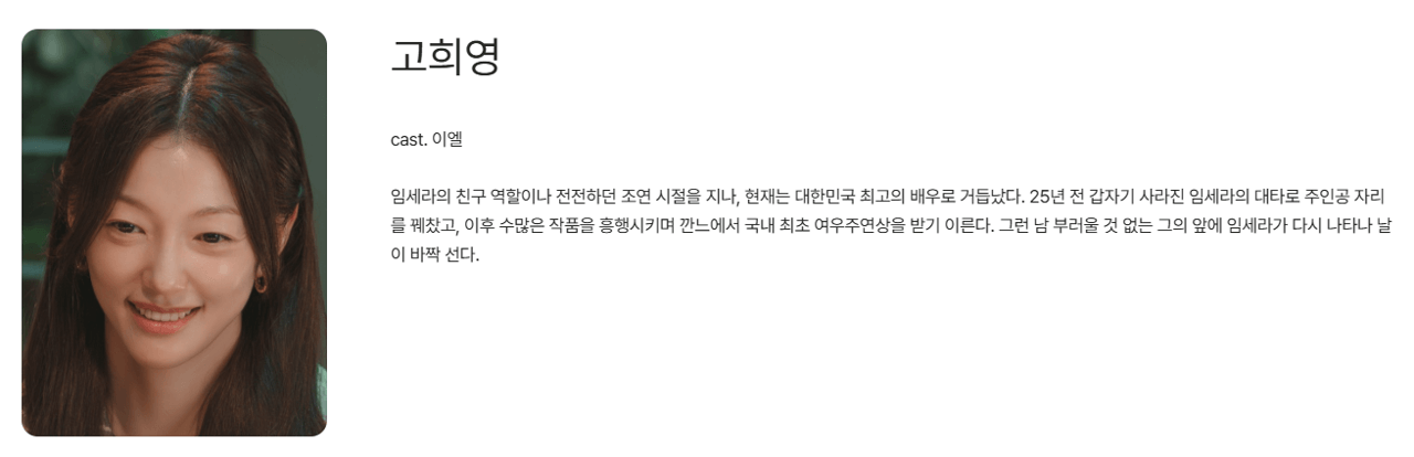 | 이다연 | 고희영 | 임세라를 질투해 사고를 유발하게 만든 라이벌입니다. |