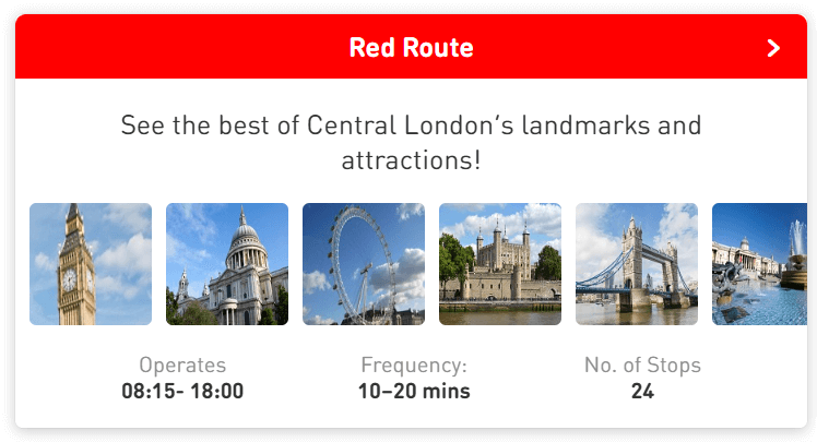 | 🔴 레드 노선 | 08:15 ~ 18:00 | 25개 정류장 | 런던 중심 명소 밀집 (버킹엄 궁전, 트라팔가 광장) |
