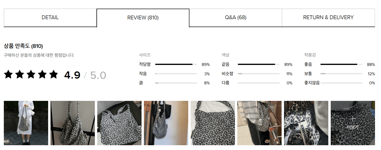 - 디자인 만족: "색감이 예쁘고 데일리로 들고 다니기 최고"라는 긍정적인 평가가 많았습니다.