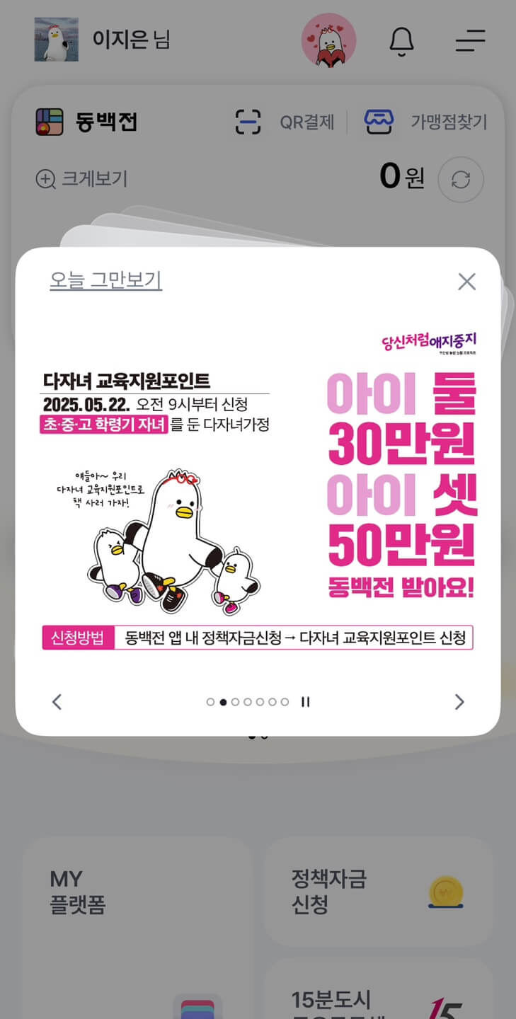 - 신청방법 : 동백전 앱 실행 > 정책자금 신청 > 다자녀 교육지원포인트