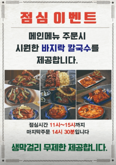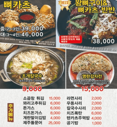 ✔ 조개칼국수, 찌개전골, 명란감자치즈 전, 뼈카츠 등 다양한 메뉴를 함께하여 다양한 연령 대의 입맛을 사로잡습니다.