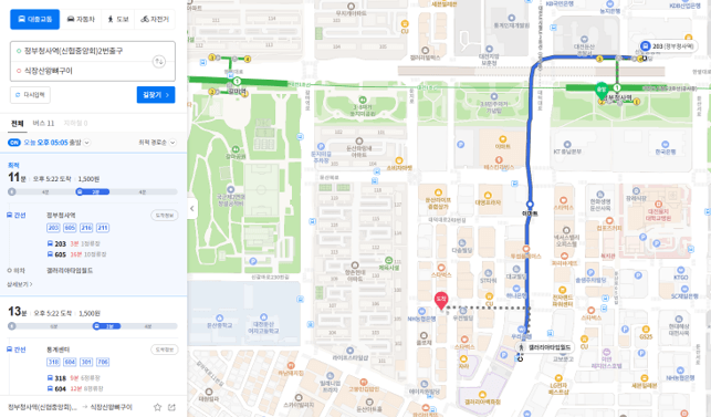 ✔ 정부청사역 2번 출구에서 버스 이동 시 203번, 605번 이용 약 11분 소요