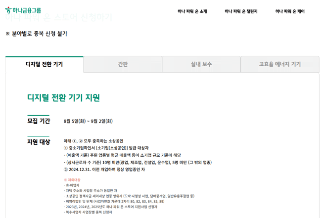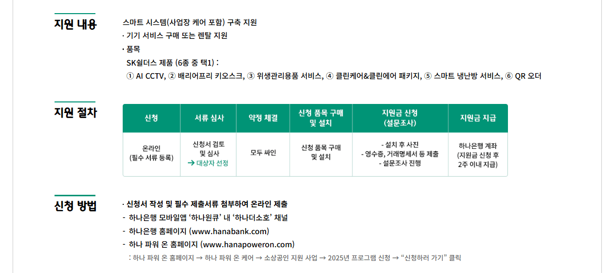 - 지원금 지급: 최종 선정 후 SK쉴더스와 계약을 맺고 기기 설치를 완료합니다. 설치 완료 후 '하나 파워 온 스토어' 홈페이지에 결과보고서를 제출하면, 승인 후 하나은행 계좌로 지원금이 지급됩니다.