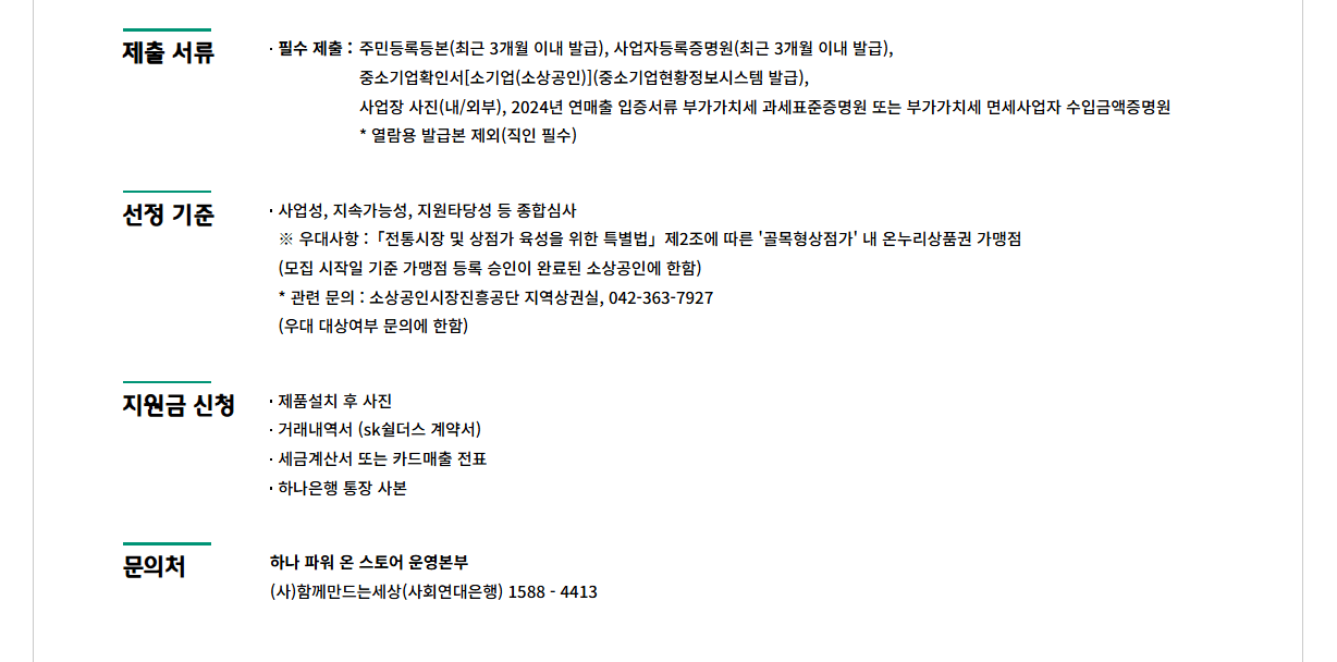 - 문의처: 일반적인 문의는 하나 파워 온 스토어 운영본부 (1588-4413)로, 우대 대상 관련 문의는 소상공인시장진흥공단 지역상권실 (042-363-7927 또는 042-363-7759)로 연락하시면 됩니다.
