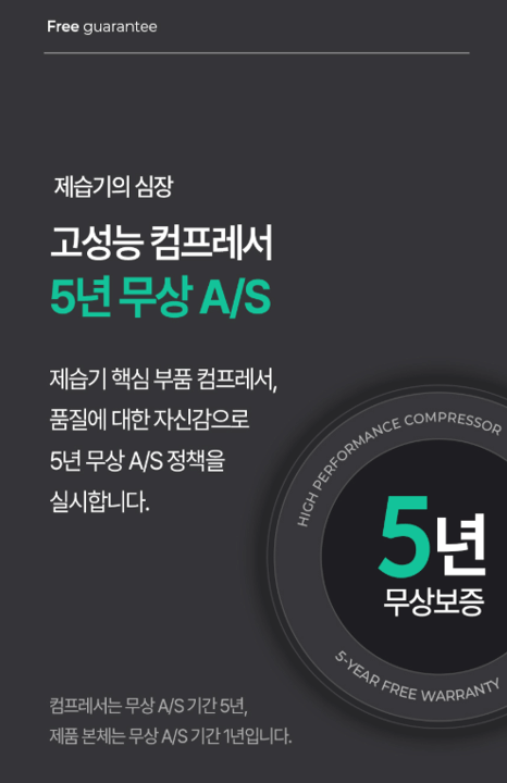 컴프레서 5년, 본체 1년의 품질 보증이 제공되며,