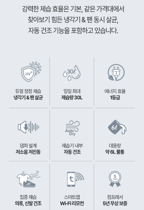 | 제습 능력 | 17L ~ 최대 30L (27℃, 60%) |