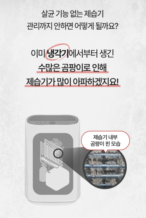 제습기 내부 냉각기는 곰팡이와 세균 번식에 취약합니다.