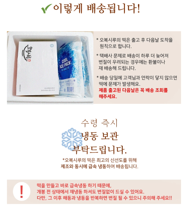 오복시루 떡은 방부제가 없으므로, 수령 즉시 냉동실에 보관해야 신선함을 오래 유지할 수 있습니다.