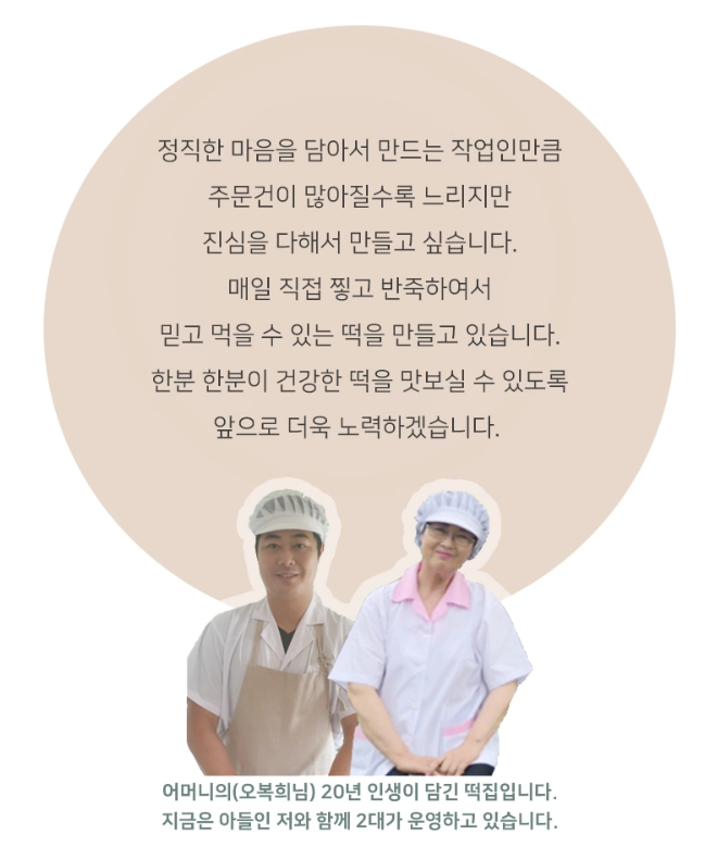 오복시루는 오복희 사장님과 아드님이 2대째 이어가는 20년 넘는 전통의 떡집입니다.