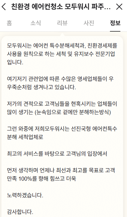 이 글에서 소개하는 파주 와동동 지역의 신뢰도 높은 청소업체 정보를 확인하시고, 가장 합리적인 선택을 하시길 바랍니다.
