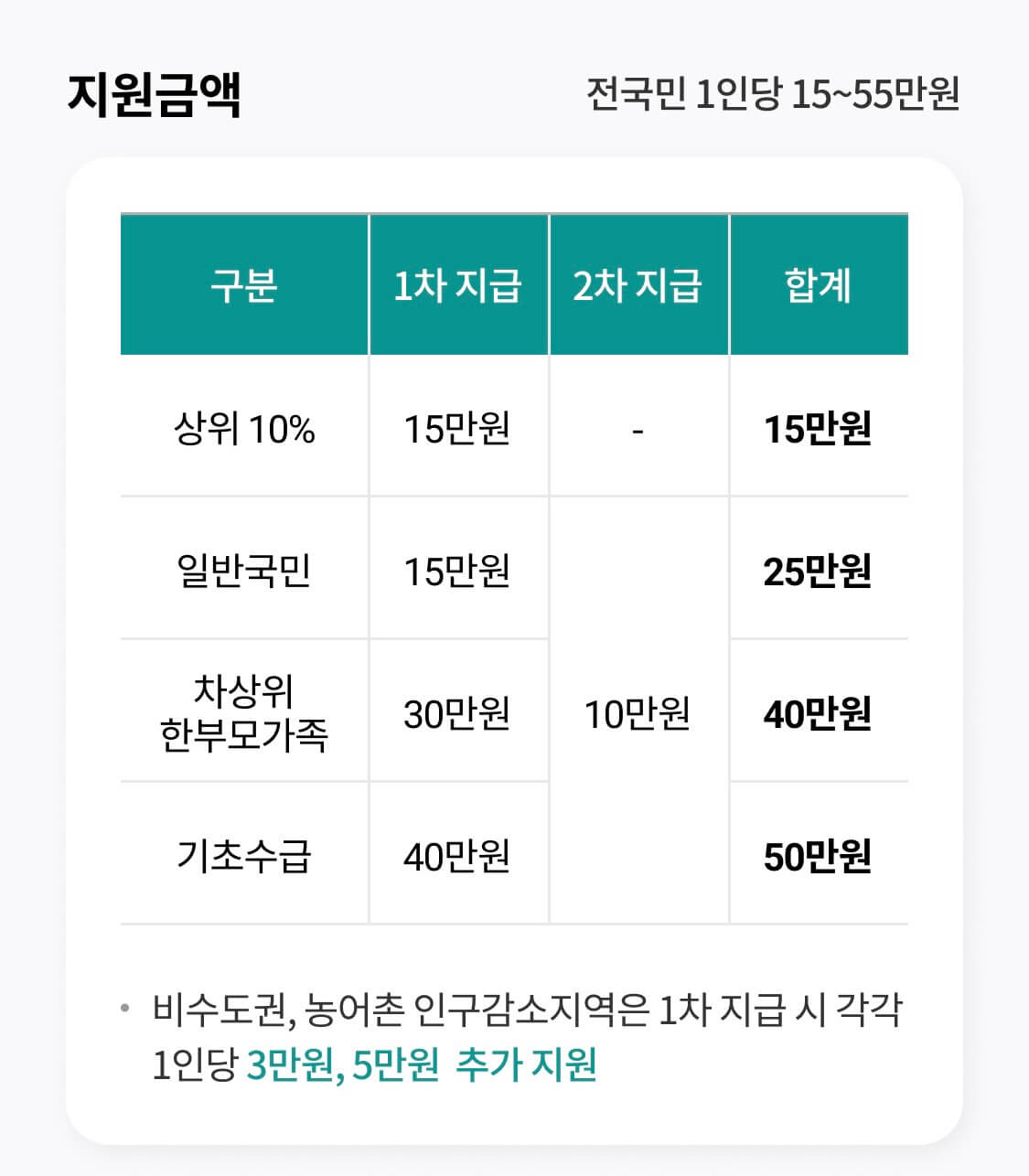 - 최대 55만원! 소득·지역별 차등 지급, 내 몫의 혜택 지금 신청. 최소 15만원부터 최대 55만원까지, 당신에게 돌아갈 혜택을 놓치지 마세요.