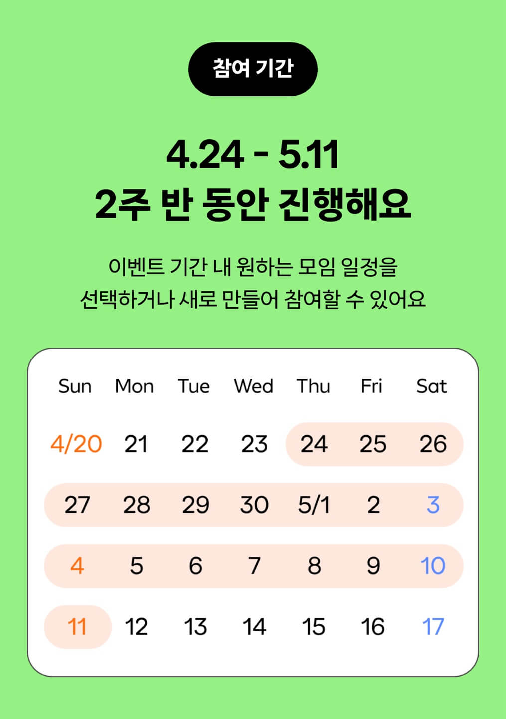 2025년 4월 24일(목)부터 5월 11일(일)까지 약 2주간 진행되며,
