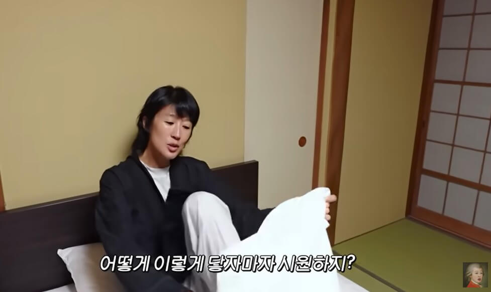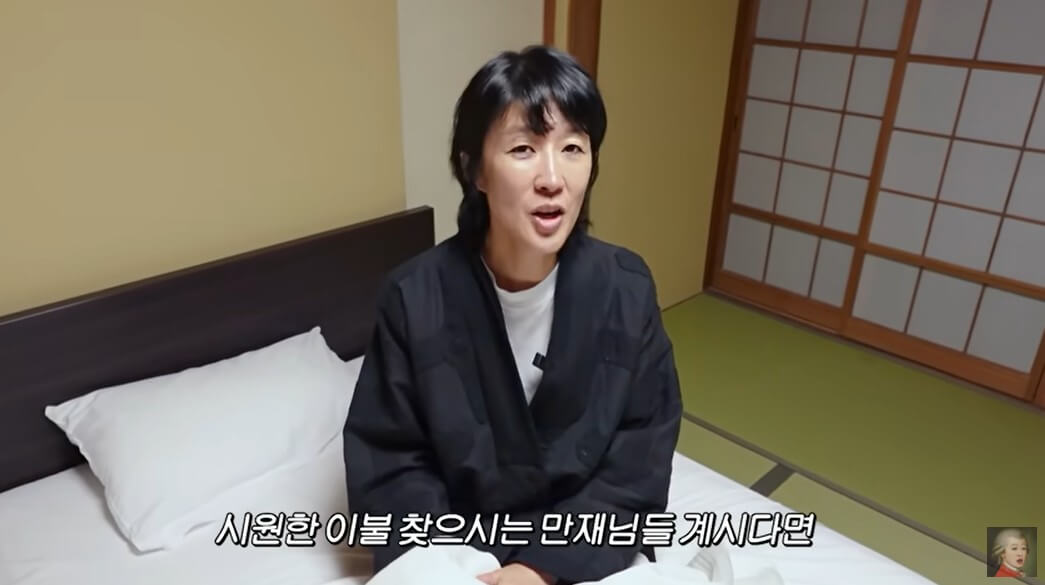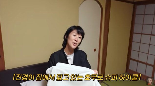 온천을 하고 개운하게 땀 흘린 후 그녀가 꺼내 든 한 장의 이불.