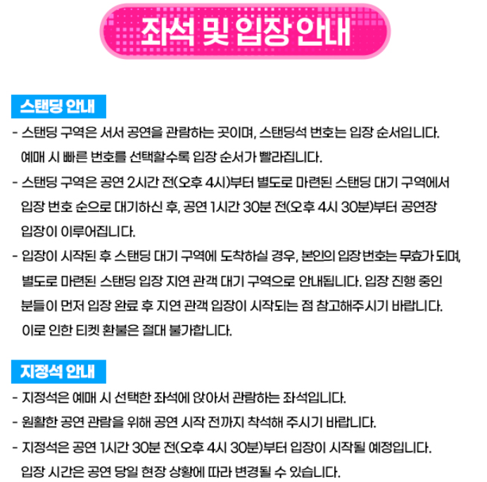 ☑ 공연 당일 티켓 부스는 공연 시작 4시간 전(오후 2시)부터 공연 시작 1시간 후(오후 7시)까지 운영됨