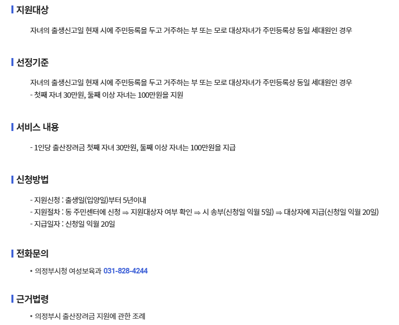 - 의정부시 출산장려금: 의정부시 자체 재원으로 지급되며, 첫째아 30만 원, 둘째아 이상 100만 원을 지원합니다.