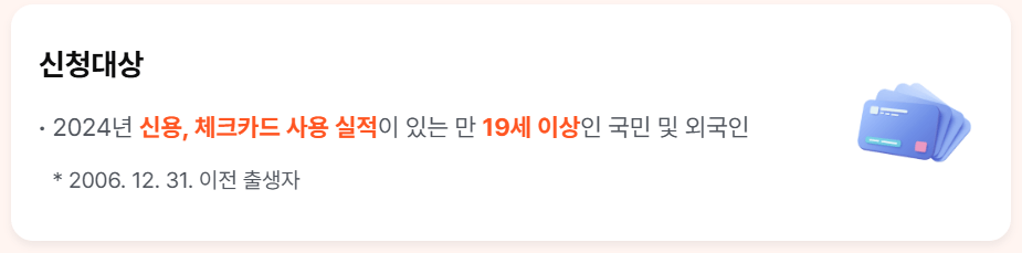 | 신청 자격 | 만 19세 이상 국민 및 외국인 중 2024년 카드 사용 실적 보유자 |