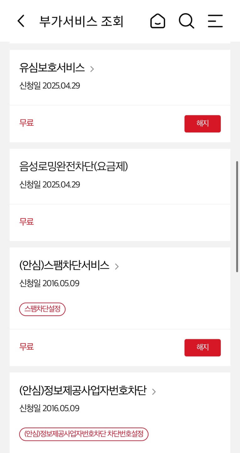 | 유심보호 서비스 | 무료 | 내가 사용하고 있는 유심(USIM)을 다른 단말기에서 사용할 수 없도록 막는 서비스 |